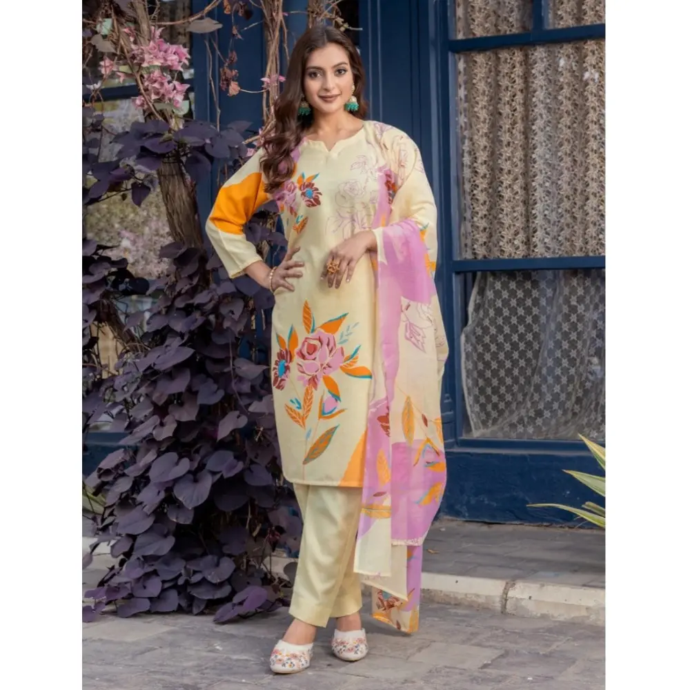 Women’s Cotton Blend Printed Kurti With Pant Dupatta Set