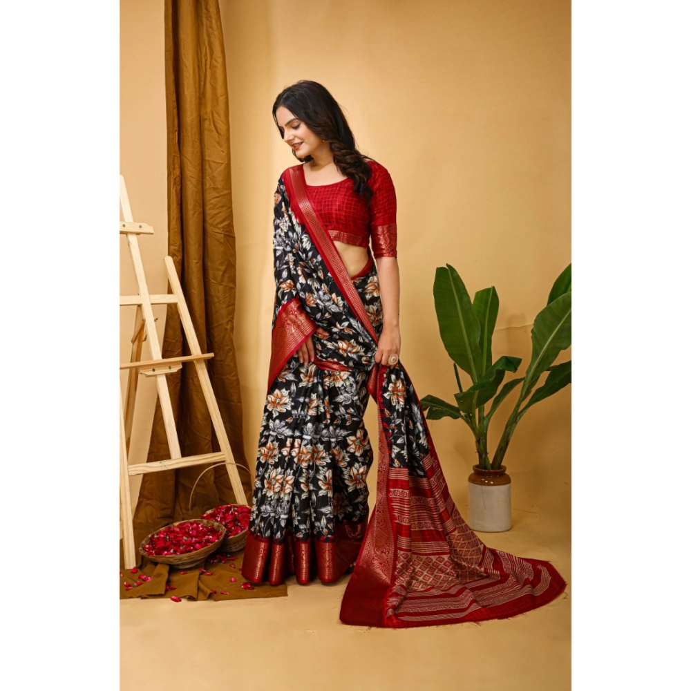 Generic Women’s Soft Dola Cotton Kalamkari Printed Saree With Unstitched Blouse 5.5Mtr (Black)
