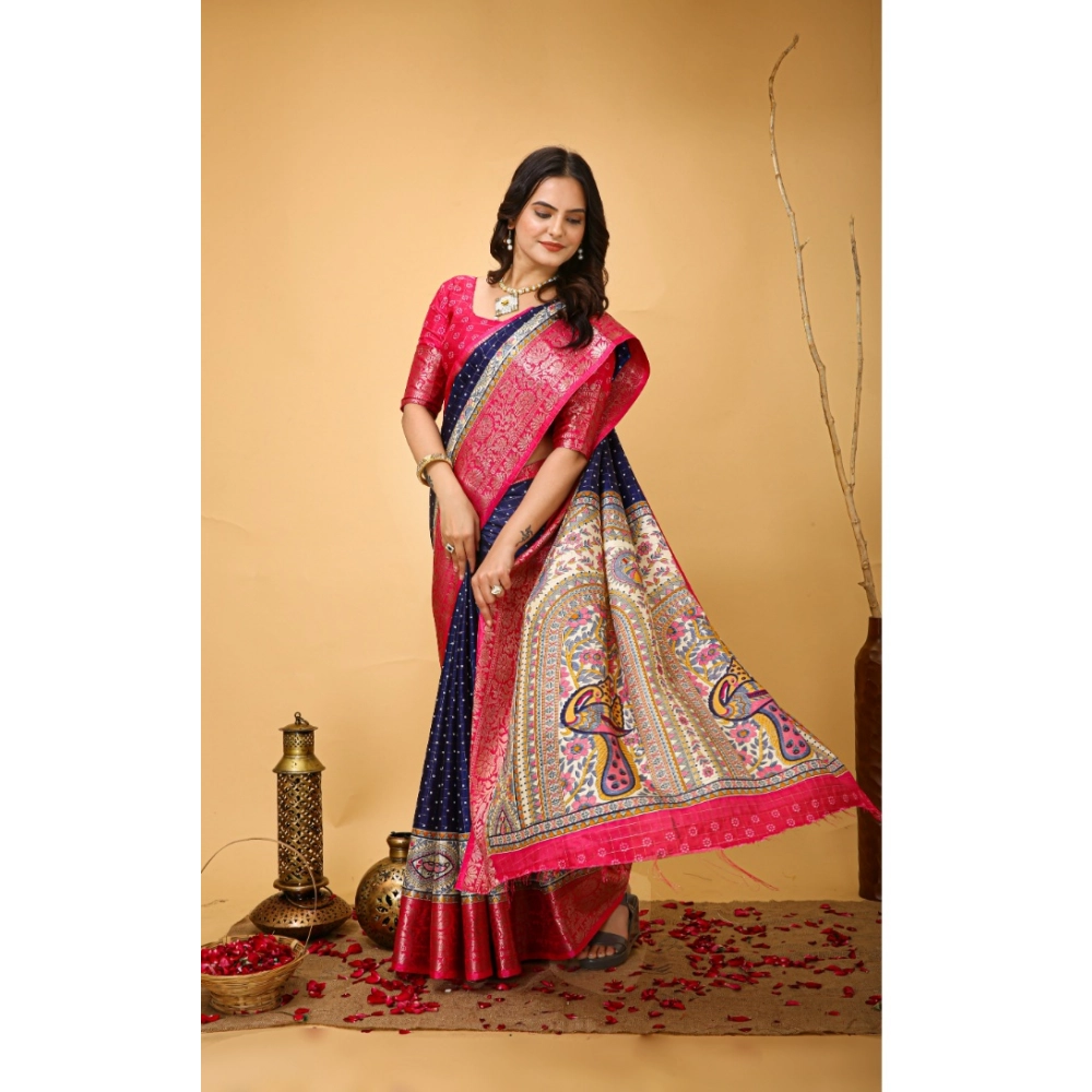 Generic Women’s Soft Dola Cotton Kalamkari Printed Saree With Unstitched Blouse 5.5Mtr (Navy Blue)
